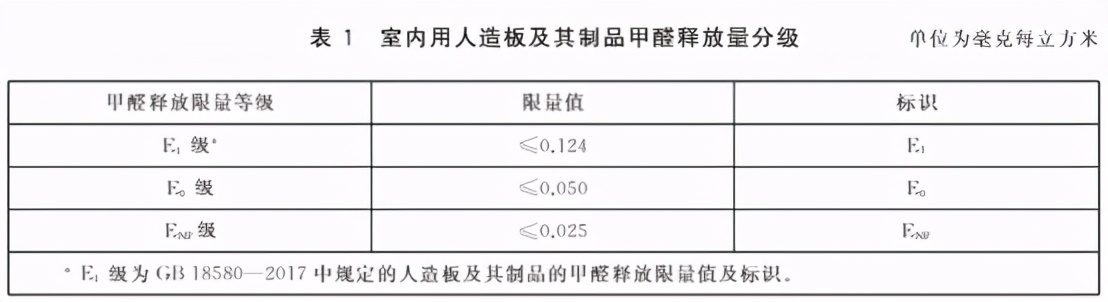 新标准将室内用人造板及其制品的甲醛释放量按照限量值分为3个等级,即E1级(≤0.124mg/m³)、E0级(≤0.050mg/m³)和ENF级(≤0.025mg/m³);其中,E1级为GB18580—2017中规定的人造板及其制品的甲醛释放限量值。